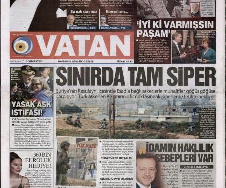 «Στα χαρακώματα στα σύνορα» είναι ο τίτλος της Vatan. H τουρκική εφημερίδα αναφέρει κοντά «στη μεθόριο Συρίας-Τουρκίας οι δυνάμεις του Άσαντ μάχονται σώμα με σώμα με τους αντάρτες και οι τούρκοι στρατιώτες έχουν λάβει θέσεις στα χαρακώματα»
