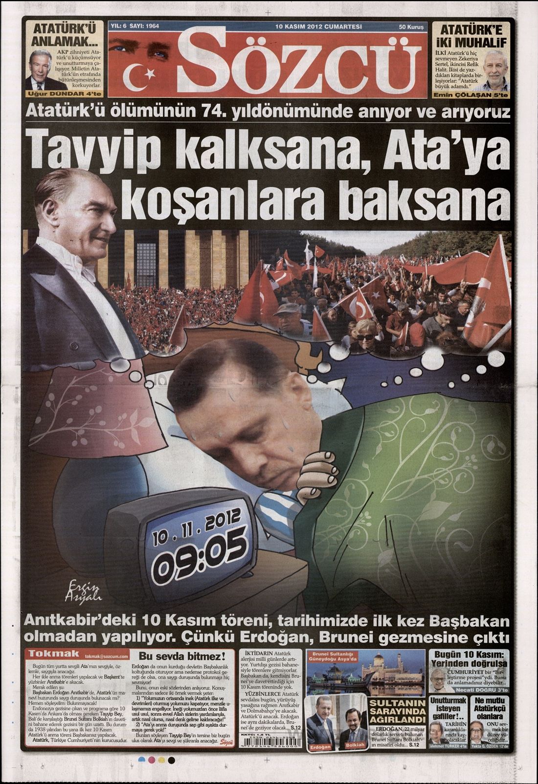 «Ταγίπ σήκω να δεις αυτούς που τρέχουν στον Κεμάλ Ατατούρκ» γράφει η εφημερίδα Sözcü με αφορμή την 74η επέτειο του θανάτου του Κεμάλ. Η τουρκική εφημερίδα αναφέρει πως « για πρώτη φορά δεν συμμετέχει ο πρωθυπουργός της χώρας στις εκδηλώσεις προς τιμή του Κεμάλ καθώς ο Ερντοάν προτίμησε να συναντηθεί με τον σουλτάνο του Μπρουνέϊ»