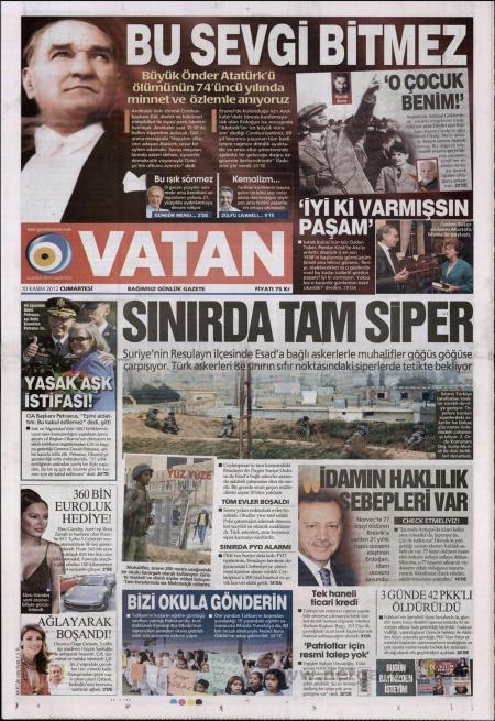 «Στα χαρακώματα στα σύνορα» είναι ο τίτλος της Vatan. H τουρκική εφημερίδα αναφέρει κοντά «στη μεθόριο Συρίας-Τουρκίας οι δυνάμεις του Άσαντ μάχονται σώμα με σώμα με τους αντάρτες και οι τούρκοι στρατιώτες έχουν λάβει θέσεις στα χαρακώματα»