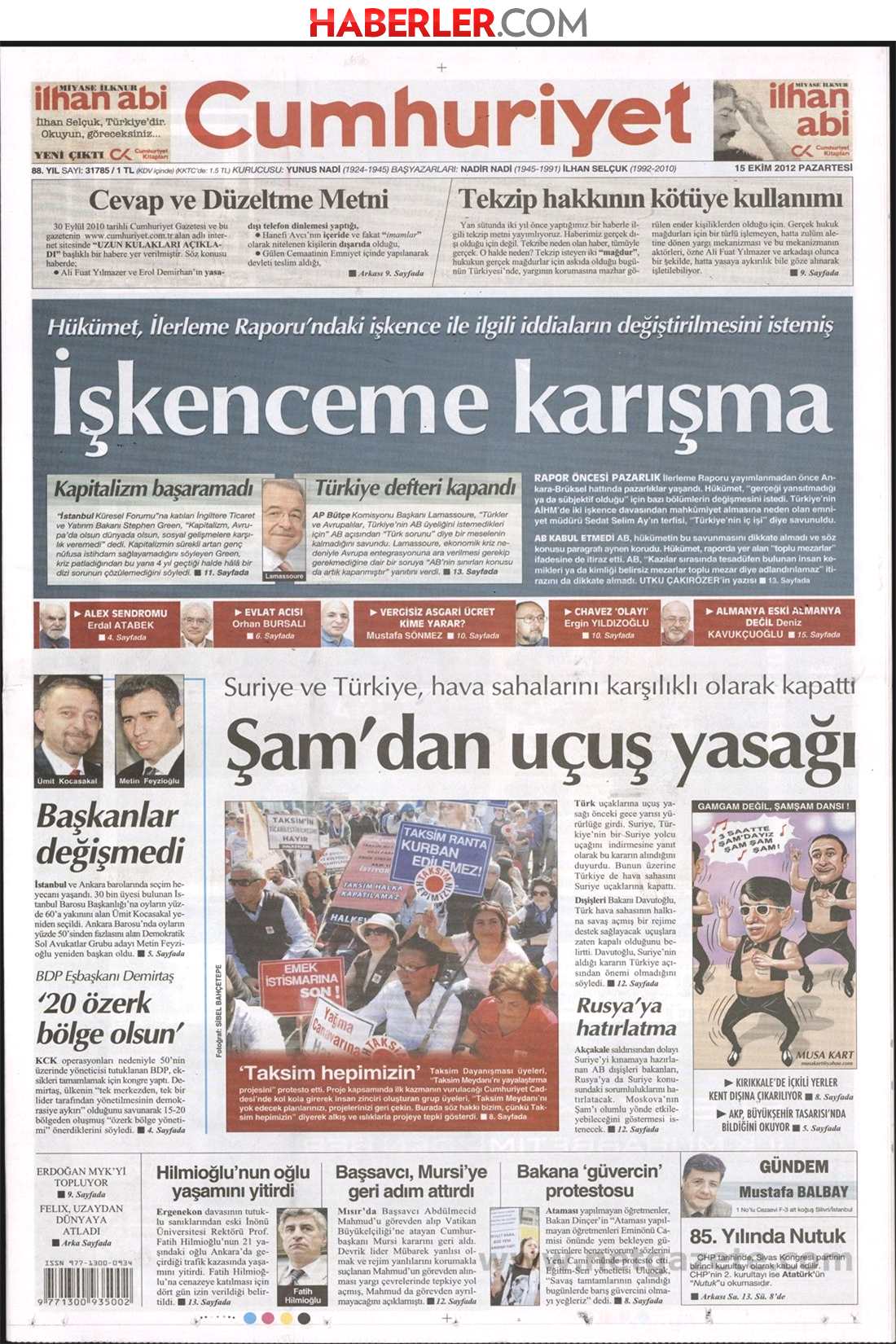 «Απαγόρευση πτήσεων από τη Δαμασκό» είναι ο τίτλος της Cumhuriyet. H τουρκική εφημερίδα γράφει πως «η Τουρκία και η Συρία έκλεισαν τους εναέριους χώρους τους. Η εφημερίδα γράφει πως « η Δαμασκός έλαβε την απόφαση αυτή μετά την αναχαίτιση του αεροσκάφους της και την προσγείωση του στην Άγκυρα»