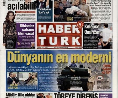 «Το πιο μοντέρνο όλου του κόσμου» είναι ο τίτλος της Habertürk και κάνει αναφορά στο τουρκικής κατασκευής άρμα μάχης ALTAY. H εφημερίδα αναφέρει πως «το πρωτότυπο του άρματος παρουσιάστηκε και πήρε βαθμό άριστα. Το 2015 θα ξεκινήσει η μαζική παραγωγή του άρματος»