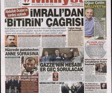 «Kάλεσμα από το Ιμραλι για τέλος» είναι ο τίτλος της Milliyet. H τουρκική εφημερίδα αναφέρει πως ο Αμντουλάχ Οτζαλάν μέσω του αδελφού του έστειλε μήνυμα στους απεργούς πείνας για να σταματήσουν τη δράση του άμεσα. Σύμφωνα με την τουρκική εφημερίδα το κάλεσμα του Κόμματος Ειρήνης και Δημοκρατίας για βελτίωση των συνθηκών κράτησης του Οτζαλάν « δείχνει πως ενδέχεται να έχει βρεθεί κάποια φόρμουλα στο ζήτημα αυτό»