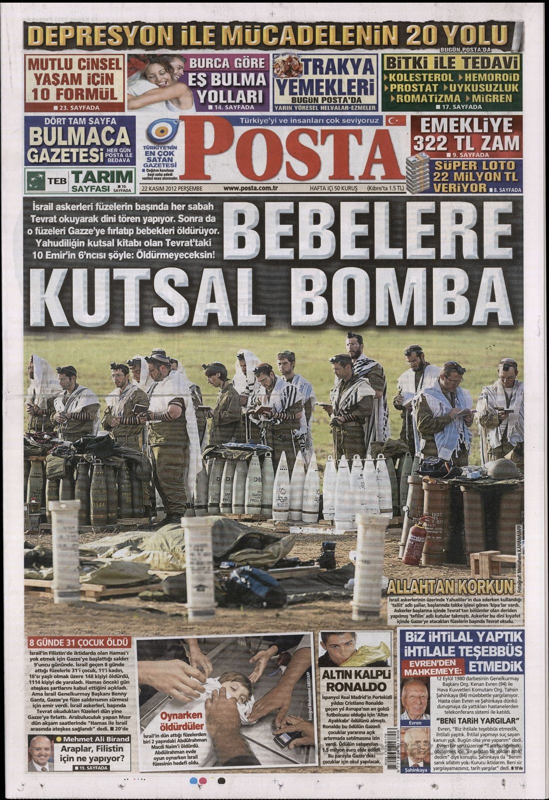 «Ιερή βόμβα στα παιδιά» είναι ο τίτλος της Posta. Η εφημερίδα με φωτογραφία δείχνει στρατιώτες του Ισραήλ να προσεύχονται μπροστά σε βόμβες και γράφει « μετά αυτές τις βόμβες τις ρίχνουν στη Γάζα πάνω σε αθώα παιδιά».