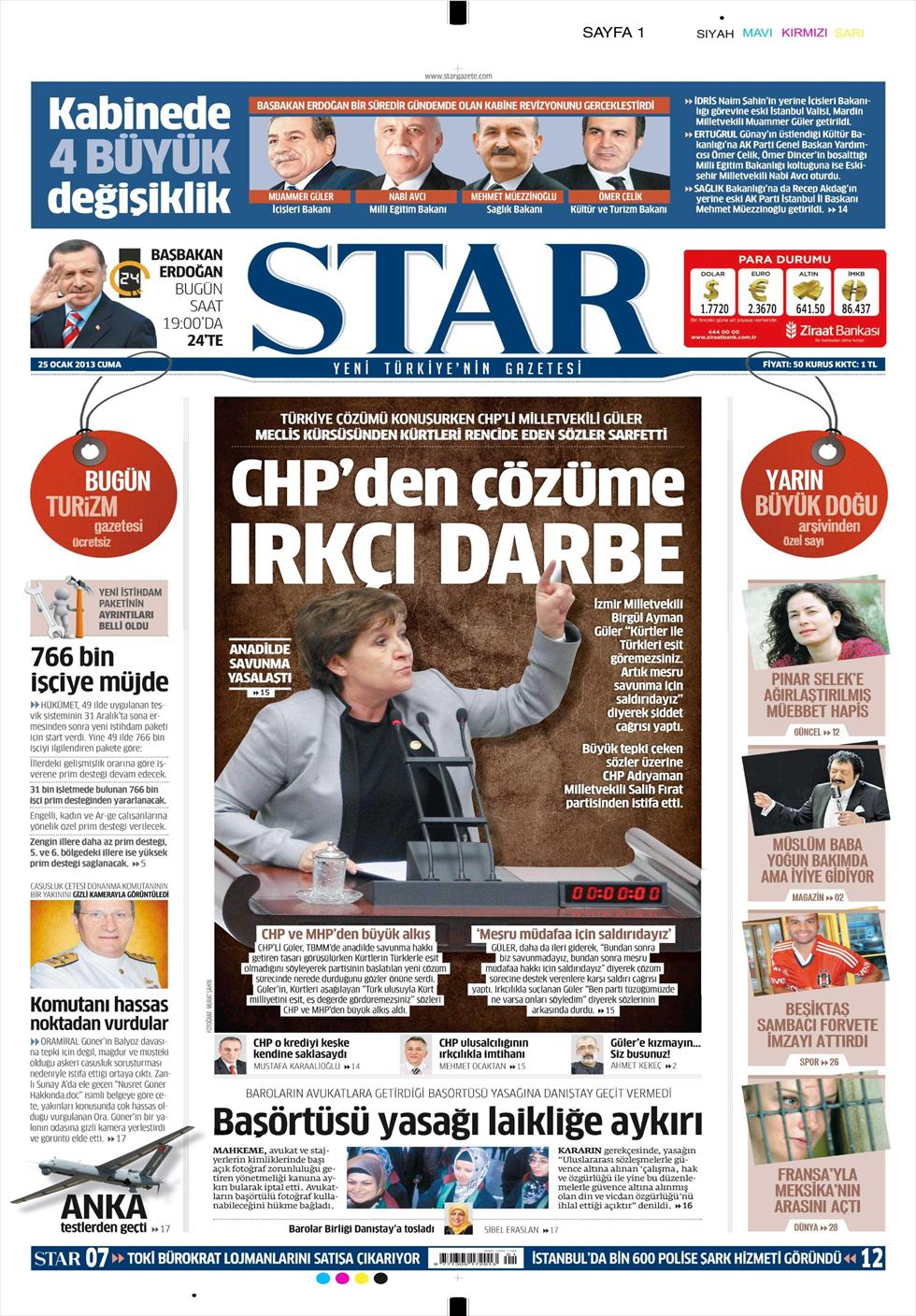 « Ρατσιστικό πραξικόπημα στη λύση από το Ρεπουμπλικανικό Λαϊκό Κόμμα» είναι ο τίτλος της Star. H τουρκική εφημερίδα αναφέρεται σε δηλώσεις της βουλευτού του Ρεπουμπλικανικού Λαϊκού Κόμματος Μπιργκιούλ Αϊμάν η οποία στην ομιλία ης στο Κοινοβούλιο δήλωσε « δεν μπορείτε να δείτε ως ίσους τους Τούρκους με τους Κούρδους. Είμαστε σε επίθεση για αυτοάμυνα». H εφημερίδα σχολιάζει πως οι δηλώσεις αυτές δημιουργού πρόβλημα στις προσπάθειες επίλυσης του Κουρδικού ζητήματος.