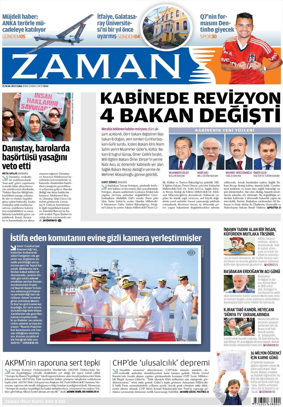«Αλλαγές στο υπουργικό συμβούλιο, άλλαξαν τέσσερις υπουργοί» είναι ο τίτλος της Zaman. “Τελικά έγιναν οι αλλαγές στα μέλη του υπουργικού συμβουλίου που αναμένονταν εδώ και καιρό. Άλλαξαν οι υπουργοί Παιδείας, Εσωτερικών, Τουρισμού και Υγείας.» γράφει η εφημερίδα.