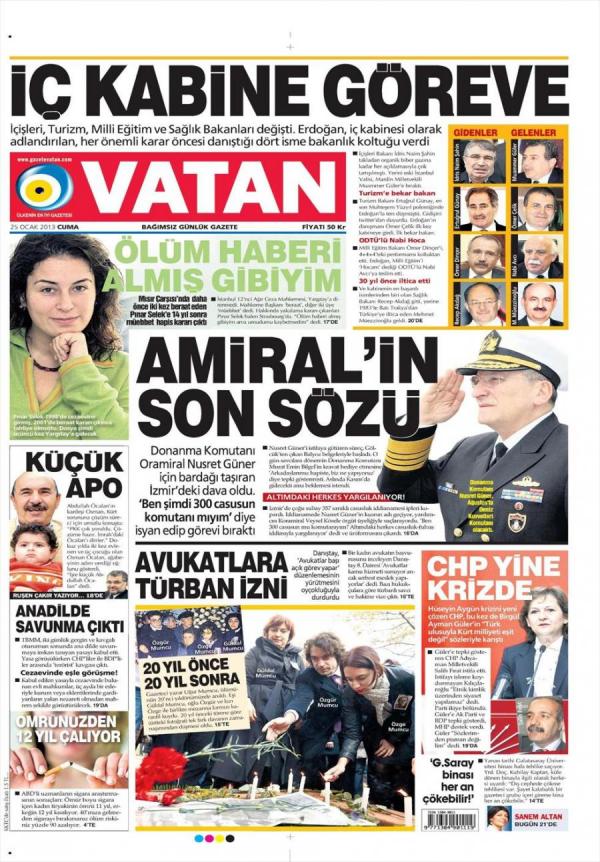 “Η τελευταία κουβέντα του ναυάρχου» είναι ο τίτλος της Vatan. H τουρκική εφημερίδα κάνει αναφορά στην παραίτηση του αρχηγού του τουρκικού Στόλου Νουσρέτ Γκιουνέρ. Η εφημερίδα τονίζει πως ο Γκιουνέρ έφτασε στα όρια του με την υπόθεση κατηγοριών με κύκλωμα πρακτόρων στη Σμύρνη και παραιτήθηκε δηλώνοντας « δηλαδή τώρα εγω είμαι ο αρχηγός των 300 πρακτόρων;”
