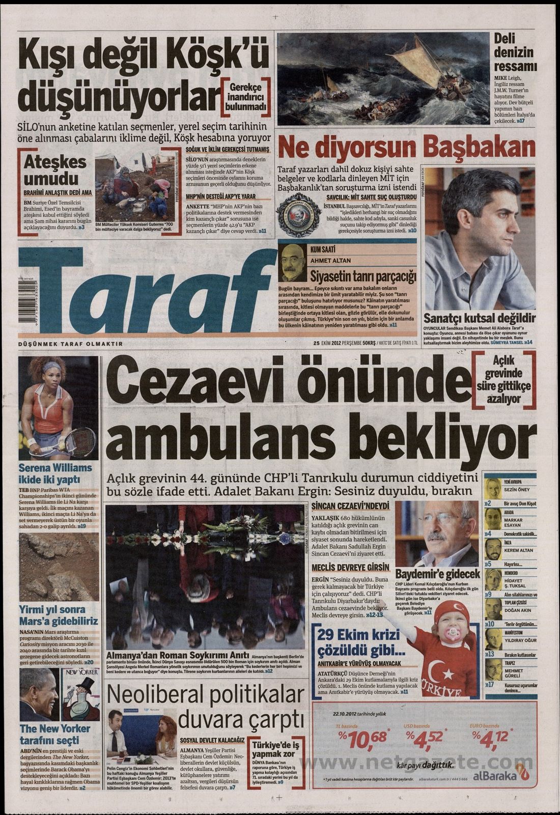 «Μπροστά στις φυλακές περιμένουν ασθενοφόρα» είναι ο τίτλος της Taraf. H τουρκική εφημερίδα αναφέρει πως η απεργία πείνας των κρατουμένων στις φυλακές υπέρ του Οτζαλάν έχει φτάσει την 44η ημέρα και πως αυξάνονται οι ανησυχίες για την υγεία τους.