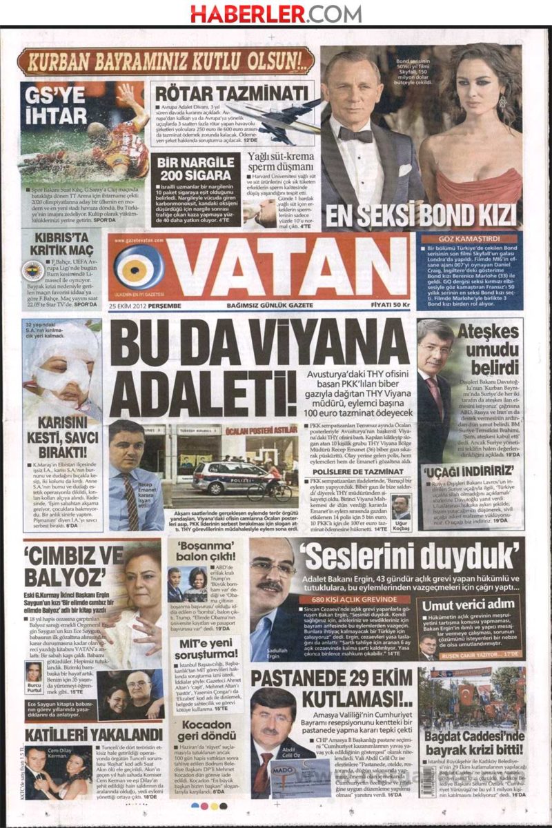 «Κι αυτή είναι η δικαιοσύνη της Βιέννης» είναι ο τίτλος της Vatan. H τουρκική εφημερίδα ισχυρίζεται πως ο διευθυντής των Τουρκικών Αερογραμμών στην Αυστρία, που είχε ψεκάσει με δακρυγόνα τους καταληψίες που ήταν μέλη του PKK, υποχρεώθηκε να τουα ποαζημιώσει με 100 Ευρώ το κάθε άτομο.