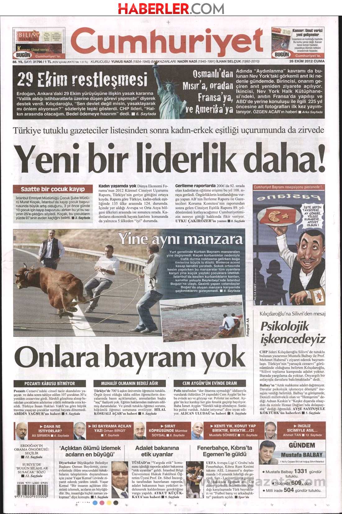 «Ακόμη μια πρωτιά από την Τουρκία» είναι ο τίτλος της Cumhuriyet. H τουρκική εφημερίδα αναφέρει πως μετά την πρωτιά στον αριθμό των φυλακισμένων δημοσιογράφων η Τουρκία διατηρεί την πρωτιά στην ανισότητα μεταξύ ανδρών και γυναικών.