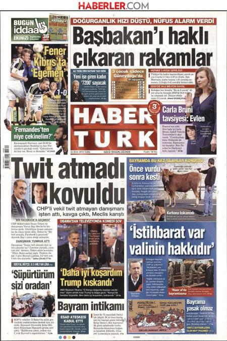 «Αριθμοί που δικαιώνουν τον πρωθυπουργό» είναι ο τίτλος της Habertürk. H τουρκική εφημερίδα αναφέρει πως μειώνεται ραγδαία ο ρυθμός αύξησης του πληθυσμού της Τουρκίας. Ο τούρκος πρωθυπουργός ζητά από τους συμπολίτες του να κάνουν τουλάχιστον 3 παιδιά.