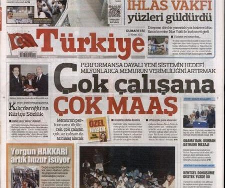 « Μεγάλος μισθός σε όσους εργάζονται περισσότερο» είναι ο τίτλος της Türkiye. Η τουρκική εφημερίδα αναφέρει πως η τουρκική κυβέρνηση φέρνει σύστημα αξιολόγησης για τους δημοσίους υπαλλήλους όπου ο κάθε εργαζόμενος θα πληρώνεται σχετικά μ την αποδοτικότητα του.
