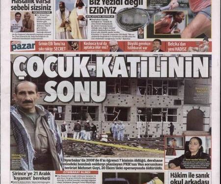 “To τέλος του δολοφόνου των παιδιών» είναι ο τίτλος της Hürriyet. H τουρκική εφημερίδα αναφέρει πως σκοτώθηκε ο δράστης, μέλος του PKK, της βομβιστικής επίθεσης που είχε πραγματοποιηθεί έω από φροντιστήριο το 2008 στο Ντιγιαρμπακίρ όπου είχαν σκοτωθεί 6 μαθητές. Η εφημερίδα γράφει πως ο δράστης σκοτώθηκε στις 20 Οκτωβρίου σε επιχείρηση του τουρκικού στρατού.