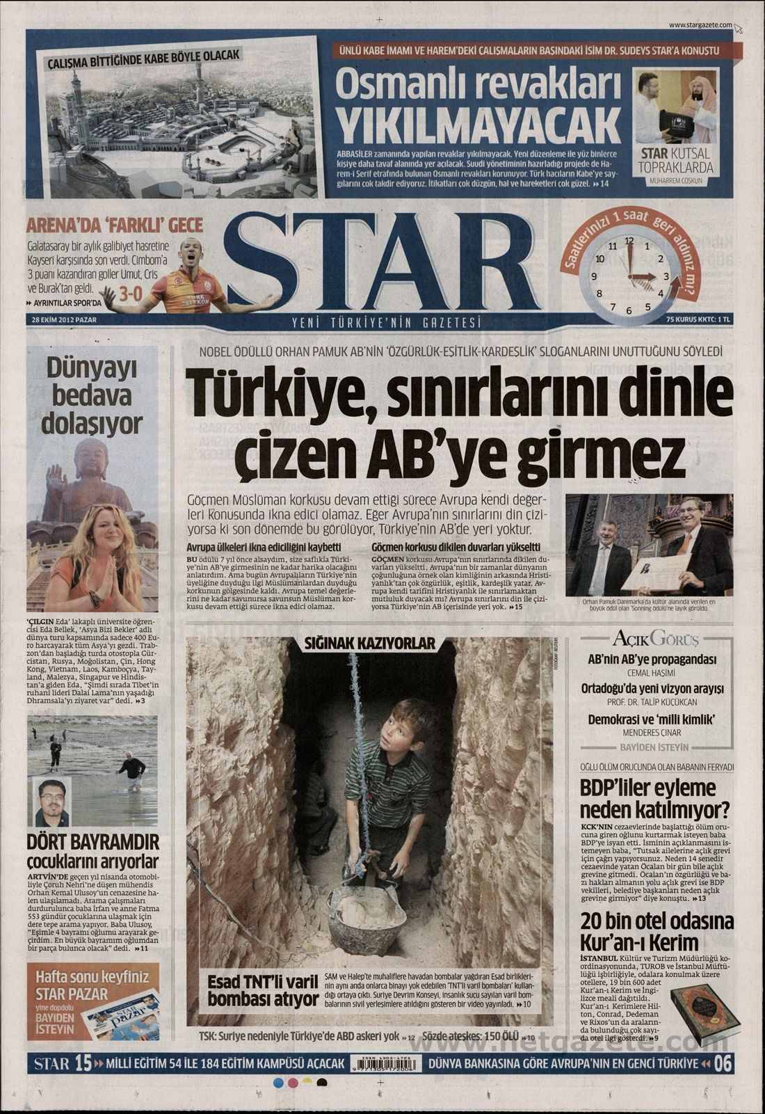 “H Toυρκία δεν μπορεί να ενταχθεί στην Ε.Ε. που καθορίζει τα σύνορα της με το θρήσκευμα» είναι ο τίτλος της STAR. H τουρκική εφημερίδα αναφέρεται σε δηλώσεις του βραβευμένου με Νόμπελ τούρκου λογοτέχνη Ορχάν Παμούκ που τονίζει πως η Ε.Ε «όσο και να ισχυρίζεται πως δεν απομακρύνεται από τις βασικές της αρχές, όσο υπάρχει ο φόβος του Ισλάμ δεν θα πείθει».