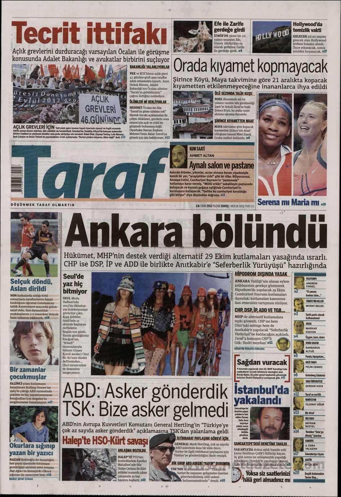 «Η Άγκυρα διχοτομήθηκε» είναι ο τίτλος της Taraf. H τουρκική εφημερίδα αναφέρει πως στην αυριανή εθνική γιορτή η αντιπολίτευση θέλει να πραγματοποιήσει συλλαλητήριο ενώ η κυβέρνηση έχει απαγορεύσει τα συλλαλητήρια τη συγκεκριμένη ημέρα.