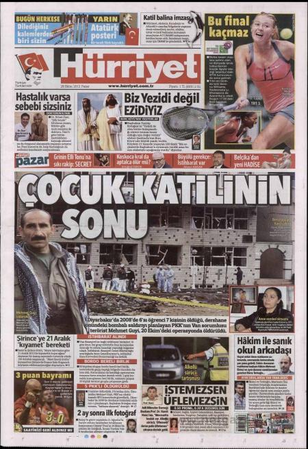 “To τέλος του δολοφόνου των παιδιών» είναι ο τίτλος της Hürriyet. H τουρκική εφημερίδα αναφέρει πως σκοτώθηκε ο δράστης, μέλος του PKK, της βομβιστικής επίθεσης που είχε πραγματοποιηθεί έω από φροντιστήριο το 2008 στο Ντιγιαρμπακίρ όπου είχαν σκοτωθεί 6 μαθητές. Η εφημερίδα γράφει πως ο δράστης σκοτώθηκε στις 20 Οκτωβρίου σε επιχείρηση του τουρκικού στρατού.