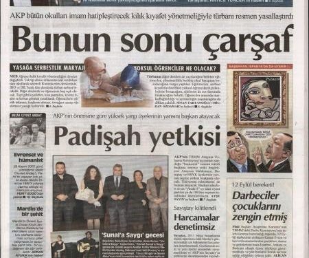 «Αυτού του νόμου η κατάληξη, είναι η μπούργκα» είναι ο τίτλος της Cumhuriyet. H τουρκική εφημερίδα αναφέρει πως οι αλλαγές της τουρκικής κυβέρνησης στην απελευθέρωση των ενδυμασιών των σχολείων «ανοίγει το δρόμο της ισλαμικής μαντίλας στα σχολεία» υποστηρίζει και αναφέρει πως στα μαθήμερα θρησκευτικών ηδη απελευθερώνουν την μαντίλα.