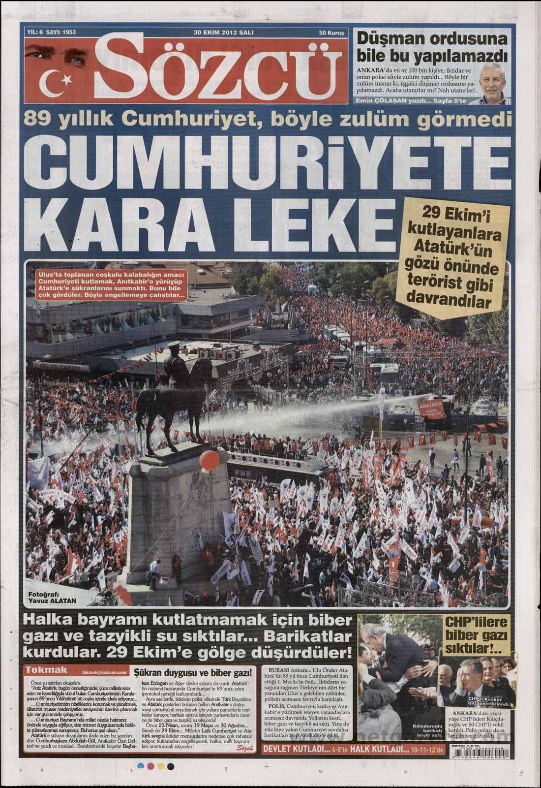 «Μαύρος λεκές στη δημοκρατία» είναι ο τίτλος της Sözcü. H τουρκική εφημερίδα αναφέρεται στα χθεσινά επεισόδια στην Άγκυρα και υποστηρίζει πως « στα 89 χρόνια της τουρκικής δημοκρατίας δεν έχει υπάρξει τέτοια βία. Η αστυνομία σε όσους ήθελα να γιορτάσουν την 29η Οκτωβρίου συμπεριφέρθηκε σα να ήταν τρομοκράτες».