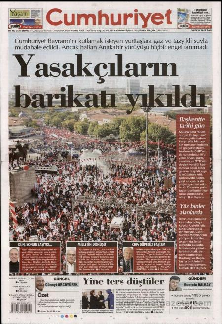 «Έπεσε το τείχος των απαγορεύσεων» είναι ο τίτλος της Cumhuriyet. H τουρκική εφημερίδα αναφέρει πως εκατοντάδες χιλιάδες άνθρωποι θέλησαν να κάνουν πορεία υπέρ της επετείου της ίδρυσης της τουρκικής δημοκρατίας «αλλά ήρθαν αντιμέτωποι με την βία της αστυνομίας, όμως τελικά κατάφεραν να σπάσουν τις περιφράξεις της αστυνομίας».