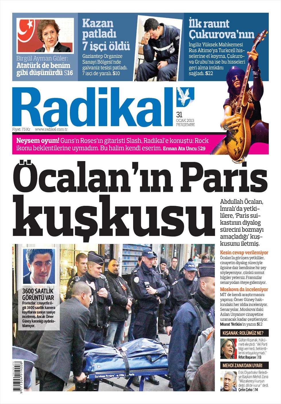 «Οι υποψίες του Οτζαλάν για το Παρίσι» είναι ο τίτλος της Radikal. Η τουρκική εφημερίδα γράφει πως ο Κούρδος ηγέτης στους επισκέπτες του στη νήσο Ιμραλι εξέφρασε τις υποψίες του , πως η δολοφονία των τριών ακτιβιστριών του PKK ενδέχεται να ήταν μια προσπάθεια για να σταματήσουν οι συνομιλίες για την επίλυση του Κουρδικού ζητήματος.
