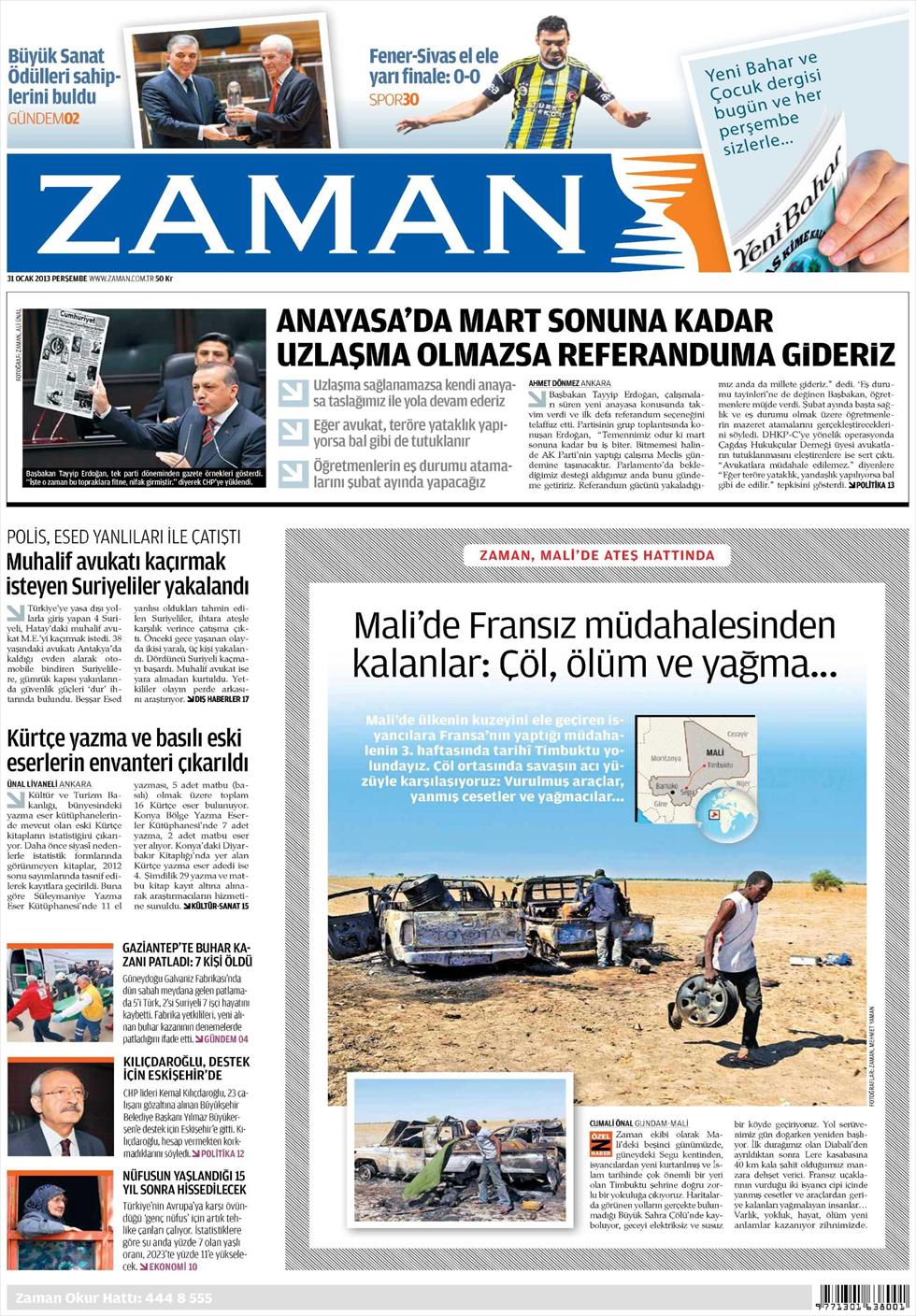 «Αν δεν υπάρξει συναίνεση στο νέο Σύνταγμα θα το πάμε σε δημοψήφισμα» είναι ο τίτλος της Zaman. H τουρκική εφημερίδα αναφέρει πως ο τούρκος πρωθυπουργός ζητά τη συμφωνία των πολιτικών κομμάτων για το νέο Σύνταγμα μεσα σε δυο μήνες. Σε αντίθετη περίπτωση απειλεί να φέρει σε δημοψήφισμα όλο το σχέδιο του Συντάγματος