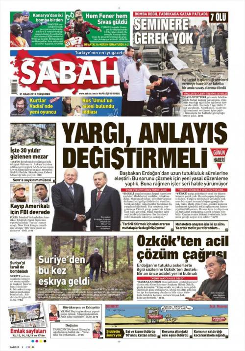 «Η δικαιοσύνη πρέπει να αλλάξει νοοτροπία» είναι ο τίτλος της Sabah. Η τουρκική εφημερίδα αναφέρεται σε δηλώσεις του Ρετζέπ Ταγίπ Ερντογάν ο οποίο τονίζει πως είναι εναντίον των μακροχρόνιας κράτησης υπόπτων και αναφέρει πως « παρα τις αλλαγές που έχουμε κάνει στους νόμους τα φαινόμενα αυτά συνεχίονται και θα πρέπει να αλλάξουν σύντομα».