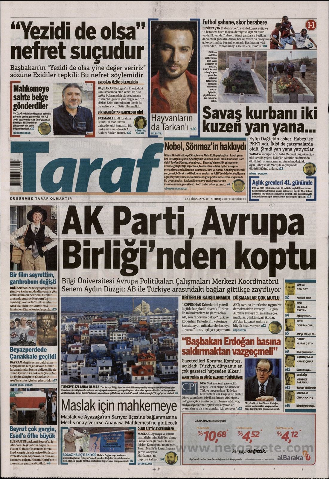 ‘To Kόμμα Δικαιοσύνης και Ανάπτυξης απομακρύνθηκε από την Ε.Ε.» είναι ο τίτλος της Τaraf. H τουρκική εφημερίδα αναφέρει δηλώσεις καθηγήτριας του πανεπιστήμιου Μπιλγκί η οποία αναφέρει πως η Τουρκία δεν ικανοποιεί τα κριτήρια της Κοπεγχάγης.