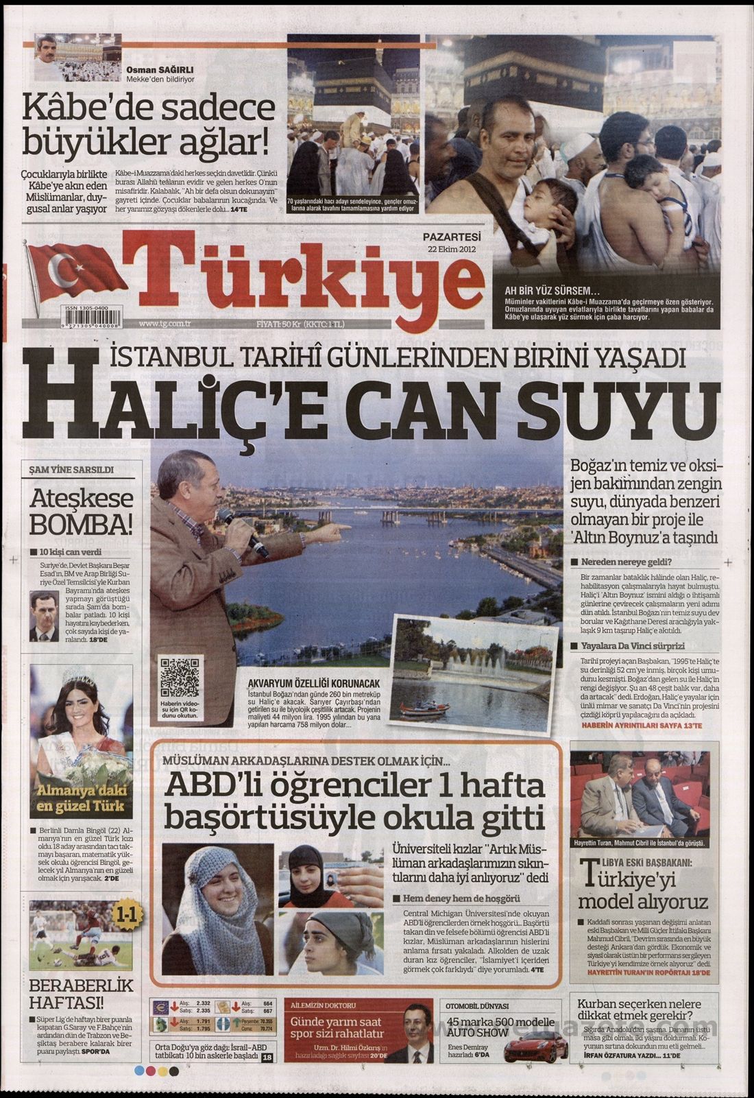 ‘Νερό ζωής στον Κεράτιο κόλπο’ είναι ο τίτλος της Τürkiye. H τουρκική εφημερίδα αναφέρει πως ο Ερντογάν εγκαινίασε το έργο το οποίο με υπόγεια τούνελ θα μεταφέρει το καθαρό νερό της Μαύρης θάλασσας από τον Βόσπορο στον Κεράτιο Κόλπο για να ζωντανέψει και πάλι η φύση τη περιοχής.