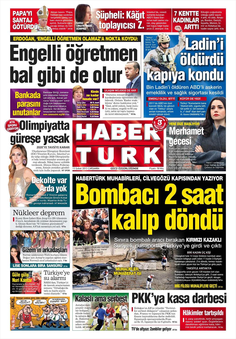 «Ο βομβιστής έμεινε δυο ώρες και έφυγε» είναι ο τίτλος της Habertürk. H τουρκική εφημερίδα αναφέρει πως σύμφωνα με στοιχεία των καμερών ασφαλείας τρεις ήταν οι δράστες της προχθεσινής βομβιστικής επίθεσης στα σύνορα Τουρκίας-Συρίας όπου είχαν σκοτωθεί 13 άνθρωποι. Ένας από τους δράστες έμεινε στην Τουρκία οι άλλοι δυο επέστρεψαν στη Συρία γράφει η εφημερίδα.