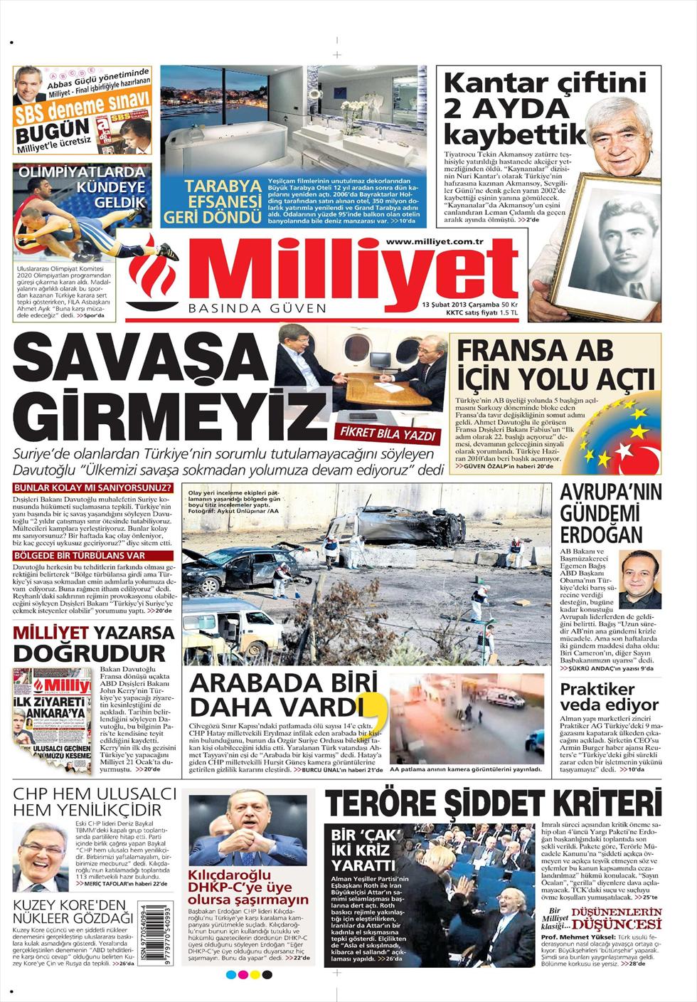«Δεν θα μπούμε σε πόλεμο» είναι ο τίτλος της Milliyet. H τουρκική εφημερίδα αναφέρεται σε δηλώσει του Αχμέτ Νταβούτογλου ο οποίος υποστηρίζει πως «κανένας δεν έχει το δικαίωμα να θεωρεί την Τουρκία υπεύθυνη για όσα συμβαίνουν στη Συρία» ενώ υποστηρίζει πως «η Τουρκία θα συνεχίσει την πορεία της χωρίς να μπει σε κανέναν πόλεμο».