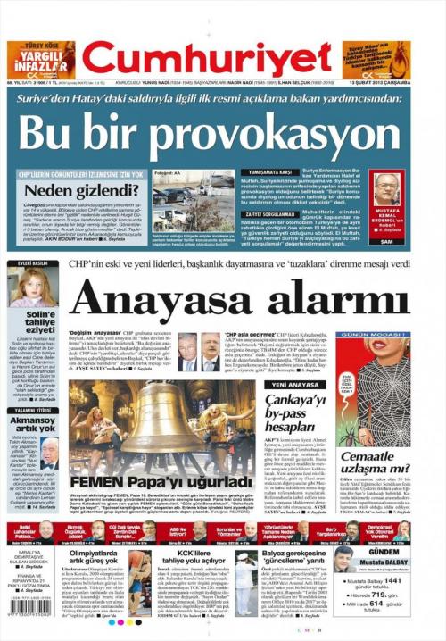 «Συναγερμός για το Σύνταγμα» είναι ο τίτλος της Cumhuriyet. H τουρκική εφημερίδα αναφέρει πως το Ρεπουμπλικανικό Λαϊκό Κόμμα το οποίο βρίσκεται στην αντιπολίτευση έχει αναστατωθεί και ετοιμάζεται να αντιδράσει έντονα στα σχέδια για το νέο Σύνταγμα όπου προβλέπεται η προεδρεύουσα δημοκρατία και «πολλά άλλα επικίνδυνα για τη δημοκρατία σημεία».