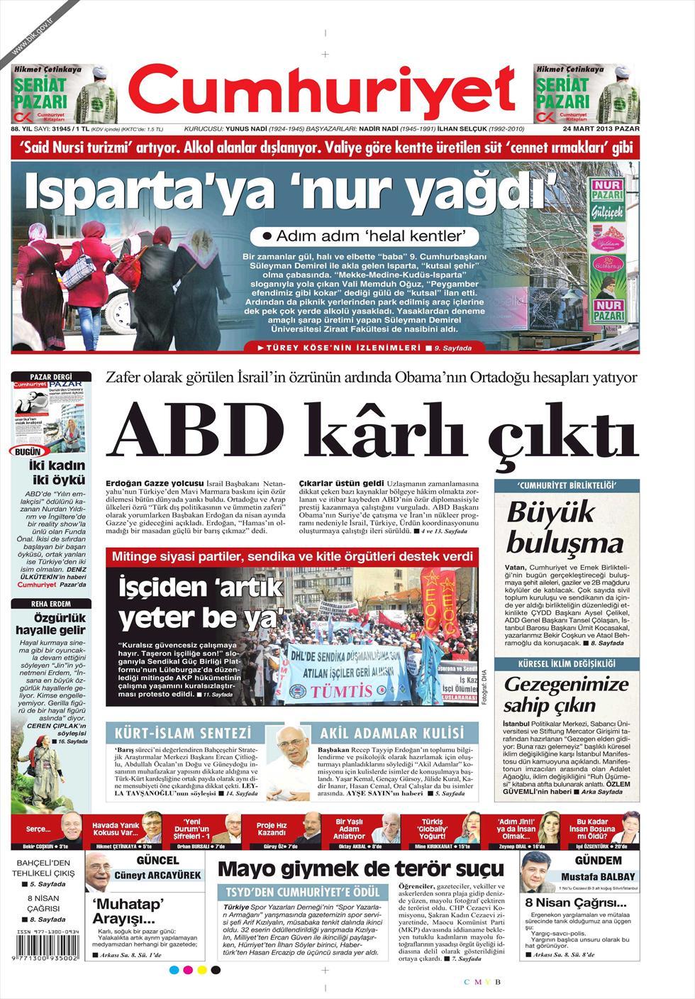 «Οι ΗΠΑ βγήκαν κερδισμένες» είναι ο τίτλος της Cumhuriyet. H τουρκική εφημερίδα αναφέρει πως « πίσω από τη συγγνώμη του Ισραήλ προς την Τουρκία κρύβονται τα σχέδια των ΗΠΑ για μια συμμαχία Τουρκίας-Ισραήλ-Ιορδανίας για τις μελλοντικές εξελίξεις στη Συρία και το Ιράν».
