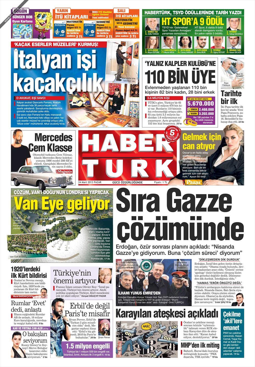 «Σειρά έχει η επίλυση του θέματος της Γάζας» είναι ο τίτλος της Habertürk. H τουρκική εφημερίδα αναφέρει πως ο Ερντογάν τον Απρίλιο θα επισκεφθεί τη Γάζα και ο ίδιος χαρακτηρίζει την επίσκεψη αυτή « πορεία επίλυσης του θέματος της Λωρίδας της Γάζας».