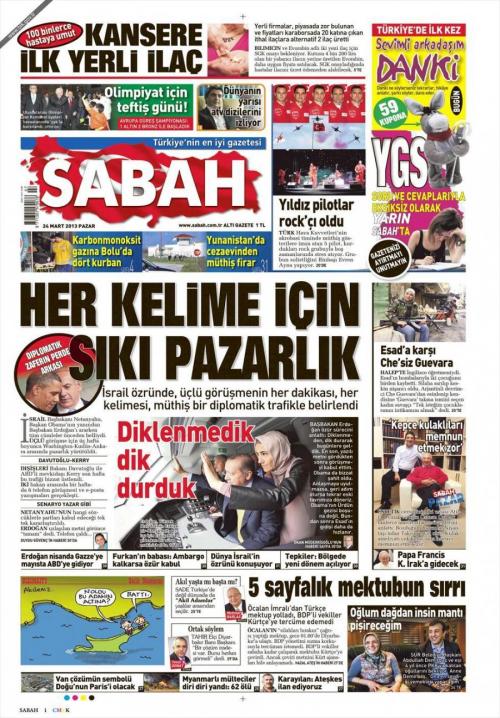 «Σκληρό παζάρι για κάθε λέξη» είναι ο τίτλος της Sabah. H τουρκική εφημερίδα γράφει πως « πίσω από τη διπλωματική νίκη της Τουρκίας έναντι του Ισραήλ υπάρχει ένα έντονο παρασκήνιο στις ΗΠΑ-Ισραήλ και την Τουρκία. Οι τρεις πλευρές μέχρι και την τελευταία στιγμή διαπραγματεύονταν λέξη προς λέξη τον τρόπο της απολογίας του Ισραήλ».