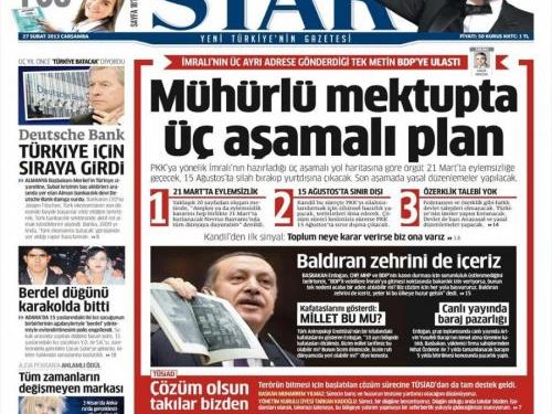 « Σχέδιο τριών βημάτων στο σφραγισμένο γράμμα» είναι ο τίτλος της STAR. H τουρκική εφημερίδα αναφέρει πως στο γράμμα που έχει στείλει ο Αμντουλάχ Οτζαλάν στο PKK “προβλέπει ένα σχέδιο κατάπαυσης του πυρός στις 21 Μαρτίου, την αποχώρηση των ανταρτών από την Τουρκία στις 15 Αυγούστου και αμέσως μετά θα ξεκινήσουν οι νομικές μεταρρυθμίσεις που θα βελτιώσουν τα δικαιώματα των Κούρδων»