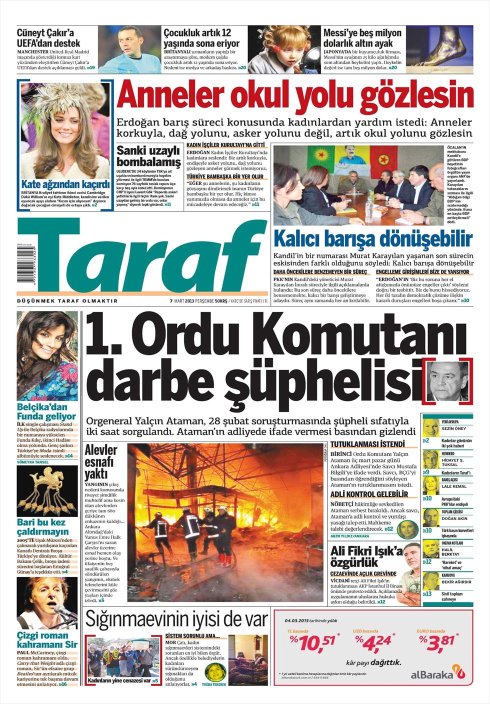 «Ο αρχηγός της Α΄ Στρατιάς ύποπτος για πραξικόπημα» είναι ο τίτλος της Taraf. H τουρκική εφημερίδα αναφέρει πως «ο αρχηγός της Ά Στρατιάς Γιαλτσίν Ατάμαν στις 3 Μαρτίου με μυστικό τρόπο μεταφέρθηκε στα δικαστήρια για να ανακριθεί ως ύποπτος συμμετοχής στο «μεταμοντέρνο» πραξικόπημα της 28ης Φεβρουαρίου του 1997. Ο εισαγγελέας ζήτησε τη σύλληψη του. Τώρα ο εισαγγελέας ζητεί την απαγόρευση εξόδου του από τη χώρα.»