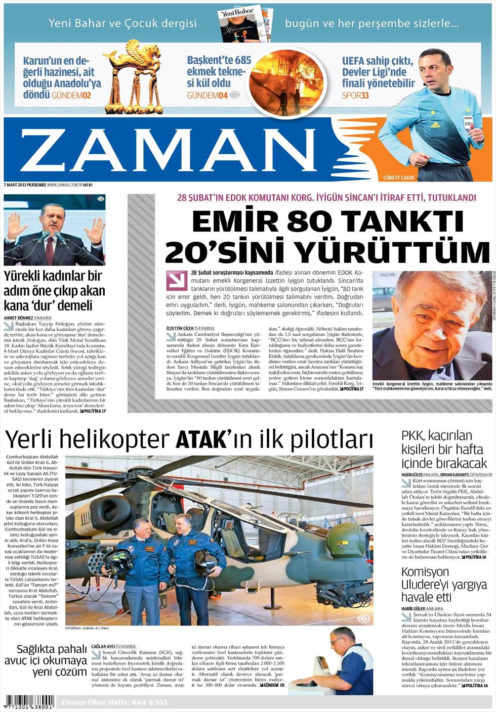 « Μου ζήτησαν 80 άρματα εγώ έβγαλα μόλις 20» είναι ο τίτλος της Zaman. H τουρκική εφημερίδα κάνει αναφορά στην απολογία του πρώην αρχηγού Εκπαίδευσης και Στρατηγικής του τουρκικού Στατού Ιζετίν Ιγίγκουν ο οποίος κατηγορείται πως στις 28 Φεβρουαρίου του 1997 είχε βγάλει τα άρματα μάχης στους δρόμους στην περιοχή Σίντζαν κοντά στην Άγκυρα ως επίδειξη δύναμης εναντίον της ισλαμικής κυβέρνησης Ερμπακάν. Ο ίδιος υποστηρίζει πως είχε λάβει εντολές από άλλους στρατηγούς και πως έβγαλε στους δρόμους λιγότερα άρματα απ’όσα του είχαν ζητηθεί.