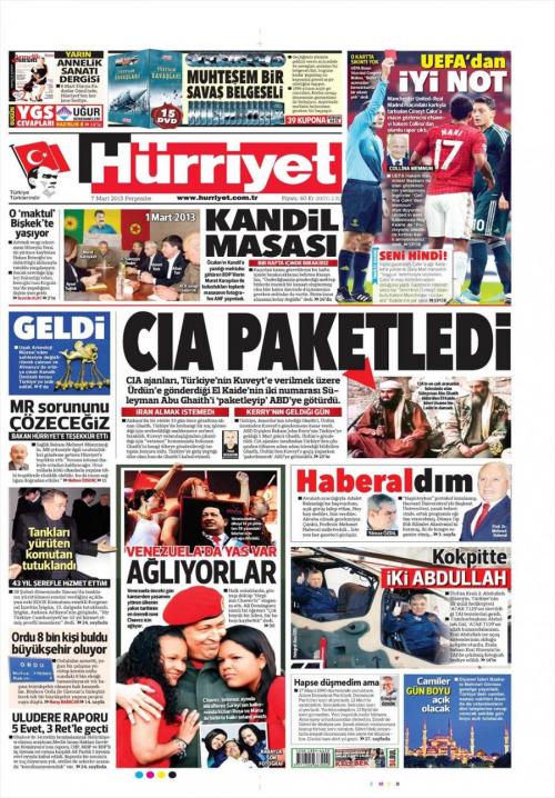 «Τον πακέταρε η CIA» είναι ο τίτλος της Ηürriyet. H τουρκική εφημερίδα αναφέρει πως την ημέρα επίσκεψης του Τζον Κέρι στην Άγκυρα οι τουρκικές αρχές συνέλαβαν και έστειλαν στην Ιορδανία το ηγετικό μέλος της Αλ Κάιντα Σουλεϊμάν Αμπου Γκάιθ, όπου εκεί τον συνέλαβαν οι πράκτορες της CIA «και τον πακέταραν με κατεύθυνση τις ΗΠΑ».