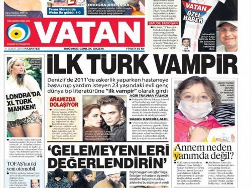 «Ο πρώτος Τούρκος βαμπίρ» είναι ο τίτλος της Vatan. H τουρκική εφημερίδα γράφει πως τούρκοι επιστήμονες κατέγραψαν στην επιστημονική κοινότητα έναν 23 χρονο νεαρό ο οποίο όταν ήταν φαντάρος ζήτησε τη βοήθεια επιστημόνων καθώς είχε ανάγκη να πίνει ανθρώπινο αίμα.