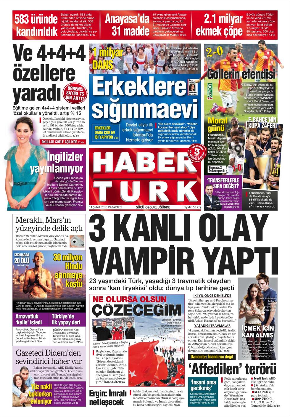 Στο ίδιο θέμα αναφέρεται με πρωτοσέλιδο της η Habertürk “ που γράφει πως 3 αιματηρά γεγονότα τον έκαναν βαμπίρ». Η εφημερίδα γράφει πως η περίπτωση του 23χρονου έχει ηδη καταγραφεί από την παγκόσμια ιατρική κοινότητα. Η ίδια εφημερίδα αναφέρει πως ο 23χρονος είχε ζητήσει το 2011 τη βοήθεια όταν ήταν φαντάρος και μετα από τις θεραπείες, δεν έχει πια κανένα πρόβλημα.