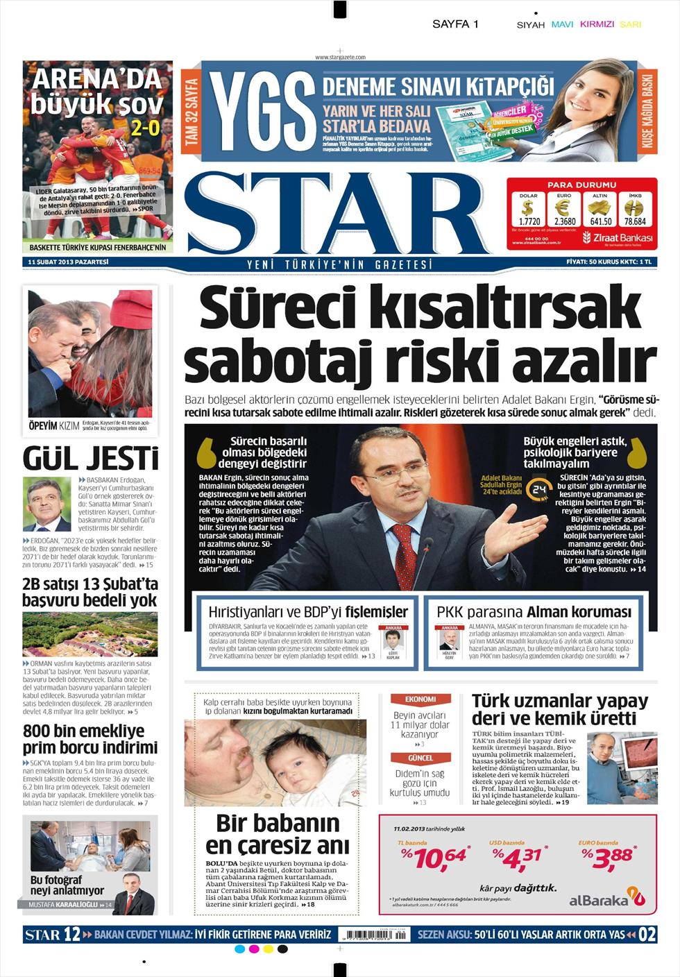 «Αν μειώσουμε την περίοδο των διαπραγματεύσεων θα μειώσουμε το ρίσκο κάποιου σαμποτάζ» είναι ο τίτλος της Star. H τουρκική εφημερίδα φιλοξενεί δηλώσεις του Υπουργού Δικαιοσύνης της Τουρκίας Σαντουλάχ Εργκίν ο οποίος υποστηρίζει πως οι διαπραγματεύσεις για την επίλυση του Κουρδικού ζητήματος πρέπει να ολοκληρωθούν σύντομα για να μην υπάρχουν άλλα προβλήματα με κάποια σαμποτάζ από οργανώσεις ή κράτη που ενδέχεται να σαμποτάρουν την επίλυση του θέματος.