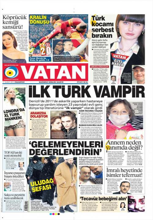 «Ο πρώτος Τούρκος βαμπίρ» είναι ο τίτλος της Vatan. H τουρκική εφημερίδα γράφει πως τούρκοι επιστήμονες κατέγραψαν στην επιστημονική κοινότητα έναν 23 χρονο νεαρό ο οποίο όταν ήταν φαντάρος ζήτησε τη βοήθεια επιστημόνων καθώς είχε ανάγκη να πίνει ανθρώπινο αίμα.