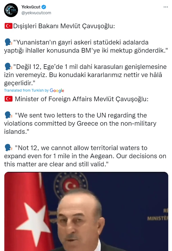 «Είχαμε ξεκινήσει διερευνητικές επαφές με την Ελλάδα. Όμως λόγω της εκστρατείας που ξεκίνησε ο Μητσοτάκης εναντίον της Τουρκίας, λόγω των προκλήσεων στο Αιγαίο, των ισχυρισμών για γενοκτονία και των πιέσεων εναντίον των Τούρκων της Δυτικής Θράκης, βάλαμε τον διάλογο σε εκκρεμότητα. Είχαμε στείλει δυο επιστολές στο ΟΗΕ το 2021 για τις παραβιάσεις που κάνει η Ελλάδα στα αποστρατιωτικοποιημένα νησιά. Κι έτσι καταγράψαμε πως η Ελλάδα επειδή παραβιάζει τους όρους των Συνθηκών Λωζάνης και Παρισίων απέναντι σε μας δεν θα μπορεί να εκφράζει δικαιώματα κυριαρχίας», σημείωσε ακόμη ο Μεβλούτ Τσαβούσογλου.