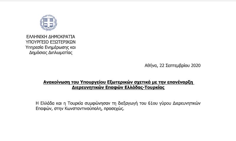 Όπως αναφέρεται στην ανακοίνωση, η Ελλάδα και η Τουρκία συμφώνησαν την διεξαγωγή του 61ου γύρου διερευνητικών επαφών, στην Κωνσταντινούπολη, το προσεχές διάστημα.