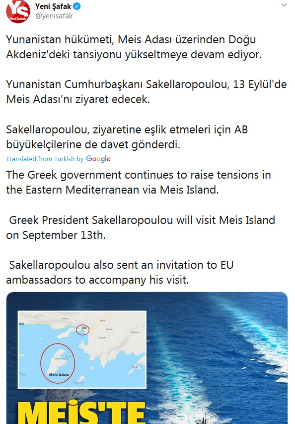 Δεν εξηγείται αλλιώς, αφού η Yeni Safak θεωρεί «νέα πρόκληση» από την Ελλάδα την επίσκεψη της Προέδρου της Δημοκρατίας στο Καστελλόριζο στις 13 Σεπτεμβρίου, για την επέτειο απελευθέρωσης του νησιού.