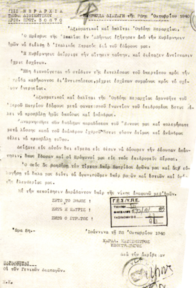 Στις πέντε και μισή το πρωί της 28ης Οκτώβρίου 1940, προτού καν λήξει το πολεμικό τελεσίγραφο που μόλις πριν από λίγες ώρες είχε επιδώσει η Ιταλία στην Ελλάδα για να ειισπράξει το «Οχι» του Ιωάννη Μεταξά εκ μέρους όλων των Ελλήνων, εκδηλώθηκε μαζική επίθεση με εισβολή ιταλικών τμημάτων στην Ηπειρο με επτά φάλαγγες, στην Πίνδο με πέντε φάλαγγες, στη βορειοδυτική Μακεδονία με πυρά πυροβολικού και με υποστήριξη από αέρος που έφτασε και σε βομβαρδισμούς στη Σαλαμίνα, στο Σκαραμαγκά, στον Πειραιά και την Πάτρα.