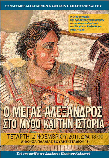 Προ των αποκαλυπτηρίων του ανδριάντα, και ειδικώς την Τετάρτη 2 Νοεμβρίου 2011, ώρα 18.00, οργανώνουμε εκδήλωση στην αίθουσα της Παλιάς Βουλής, με θέμα «Ο Μέγας Αλέξανδρος στο Μύθο και την Ιστορία», με σκοπό να παρουσιαστεί το έργο και η προσωπικότητά του μεγάλου στρατηλάτη.