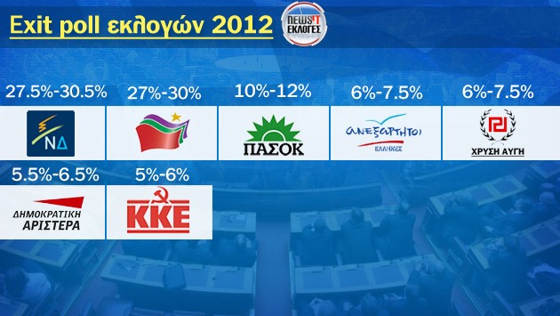 Απόλυτο ντέρμπι με ελάχιστο προβάδισμα της ΝΔ δίνει το κοινό exit poll των τηλεοπτικών σταθμών. Από την εικόνα που δημιουργεί δεν προκύπτει ξεκάθαρα ποιός θα είναι ο νικητής των εκλογών τον οποίο θα γνωρίζουμε μετά τις 10 το βράδυ όταν θα έχει συγκεντρωθεί το 15% των επίσημων αποτελεσμάτων. Η ΝΔ, κατάφερε να αυξήσει πολύ τα ποσοστά της αλλά όχι και να δημιουργήσει την διαφορά ασφαλείας από τον ΣΥΡΙΖΑ ο οποίος με την επίδοσή του αγγίζει τα όρια του ρεκόρ. Μέχρι πριν από 8 μήνες ήταν στο 4%, στις 6 Μαϊου σκαρφάλωσε στο 17% και σήμερα είναι στο 28,5%. Το ΠΑΣΟΚ σημειώνει ελαφρά πτώση αλλά μένει διψήφιο, ενώ πτώση καταγράφει και το κόμμα του Πάνου Καμμένου που διατηρεί όμως την 4η θέση. Από 10,6% παίρνει 6,8%. Η Χρυσή Αυγή παρόλα όσα μεσολάβησαν έρχεται 5η και δεν καταγράφει σημαντικές απώλειες ποσοστών αφού από το 6,97% πάει στο 6,8%. Το κόμμα του Φώτη Κουβέλη, κρατάει σημαντικά ποσοστά και ρυθμιστικό ρόλο, ενώ αυτή η εκλογική μάχη είναι μια ηχηρή αποτυχία για το ΚΚΕ το οποίο απο τρίτος πόλος που ήταν επι δεκαετίες, μπαίνει στην Βουλή ως τελευταίο από τα 7 που έχουν κοινοβουλευτική εκπροσώπηση.