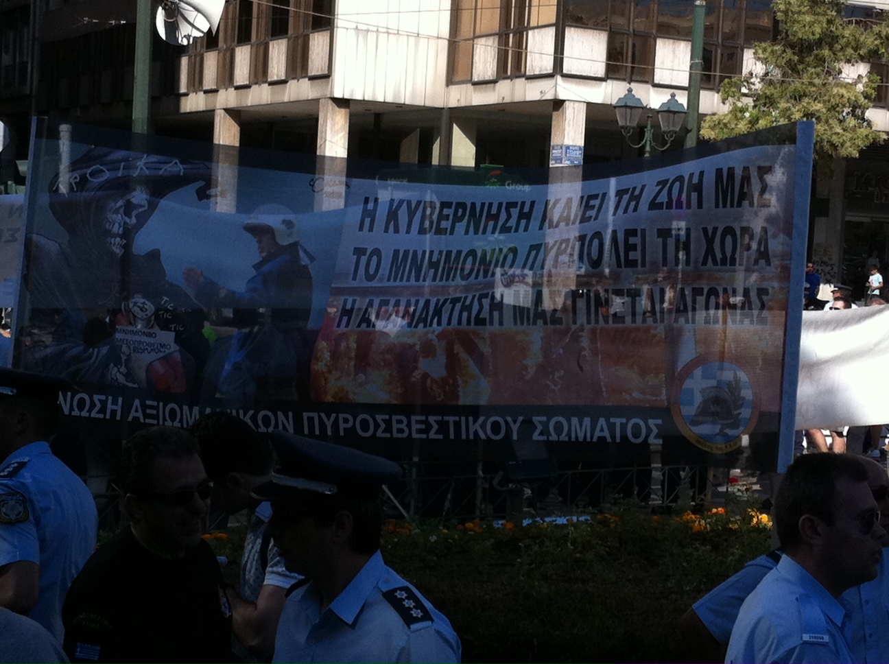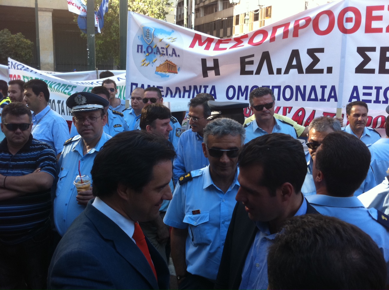 Μπορεί οι στρατιωτικοί να κατηφόρησαν στη Πλάκα αντί να ανηφορίσουν προς το Σύνταγμα ,οι άλλοι ένστολοι όμως της ΕΛΑΣ, της Πυροσβεστικής και του Λιμενικού Σώματος, έκαναν κανονικά τη συγκέντρωσή τους στη πλατεία Κολοκοτρώνη. Πλακάτ, συνθήματα και πάθος. Παρόντες δυο βουλευτές του ΛΑΟΣ, ο Άδωνις Γεωργιάδης και ο Αθανάσιος Πλεύρης.