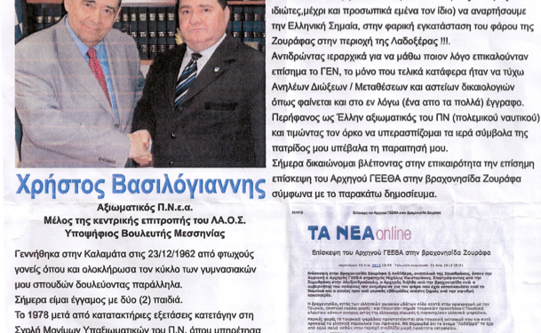 Την 27-4-2012 έφθασε στα χέρια μου διαφημιστικό προεκλογικό φυλλάδιο του υποψηφίου βουλευτή του κόμματός σας, κ. Χρήστου Βασιλόγιαννη, αξιωματικού ΠΝ ε.α., μέλους της κεντρικής επιτροπής του ΛΑ.Ο.Σ.