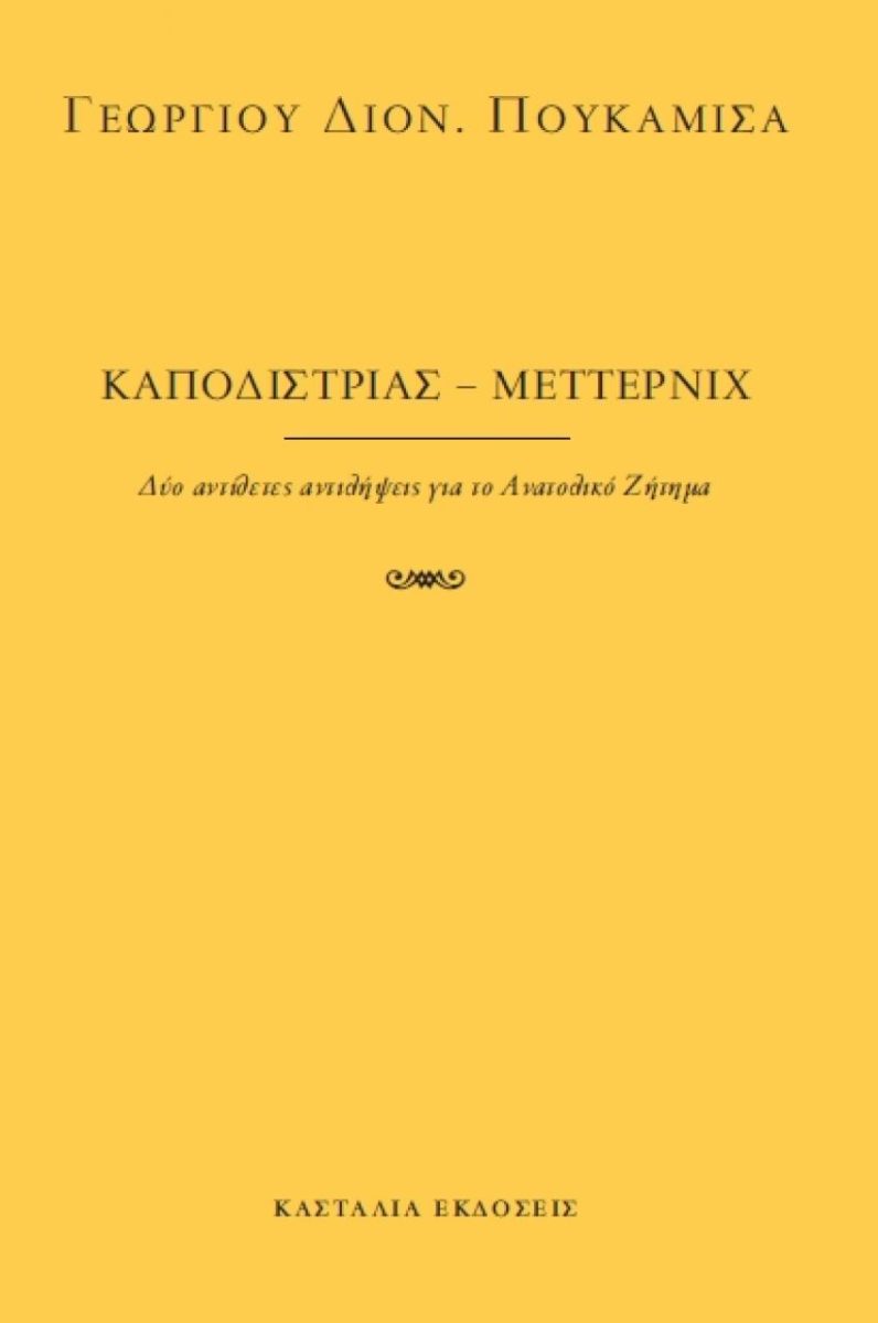 Το δεύτερο βιβλίο «Καποδίστριας-Μέττερνιχ: Δύο αντίθετες αντιλήψεις γιά το Ανατολικό Ζήτημα» σκιαγραφεί τη μακρόχρονη διελκυστίνδα μεταξύ του Καποδίστρια, Υπουργού Εξωτερικών του τσάρου Αλεξάνδρου Α΄ και του Μέττερνιχ, Καγκελαρίου της πολυεθνικής Αυστρίας και αρχιερέα της Ιεράς Συμμαχίας, αναφορικά με την πολιτική των ευρωπαϊκών δυνάμεων έναντι της Οθωμανικής Αυτοκρατορίας. Παρουσιάζονται οι απόψεις του Καποδίστρια, υπέρ μιάς αποφασιστικής αντιμετώπισης του Σουλτάνου, οι οποίες επεκράτησαν σταδιακά, μετά την επιστροφή του Τζωρτζ Κάννιγκ στο Foreign Office το Σεπτέμβριο του 1822 και το θάνατο του αμφιπλέοντος Τσάρου τον Δεκέμβριο του 1825. Η ανατολική πολιτική του Μέττερνιχ κατέρρευσε, αλλά η Ρωσία είχε χάσει έδαφος, υπέρ της Βρετανίας, στον αγώνα επιρροής των ελληνικών πραγμάτων…